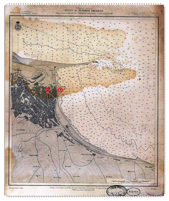 Per questa operazione, solo parzialmente (e per forza di cose) fantastica, mi sono appoggiato ad una pianta di Termini del 1896 (a sinistra) che, anche se sfigurata da una grossa macchia, risulta nondimeno molto precisa (utilizza capisaldi rilevati dalla Marina Militare) e molto dettagliata (vi sono segnati sia i bagni vecchi che i nuovi, l’attiguo carcere, la fontana monumentale del Cornelio - vedi CA 25 - e persino gli scogli della Gisira).