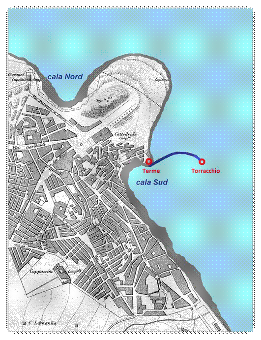L’interesse di un paio di termitani per la mappa della News precedente mi dà animo ad esplicitare con un disegno orientativo (a destra) quanto ebbi ad accennare a p. 14 del mio opuscolo La città sbancata a proposito del mare e del porto di Termini.