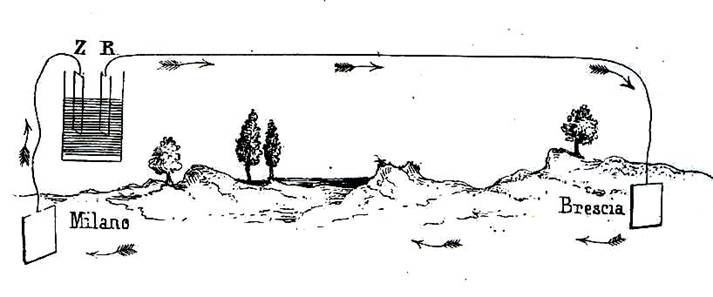 “percorre” il circuito di andata (filo di rame o di ferro sospeso su pali) fino a Brescia,